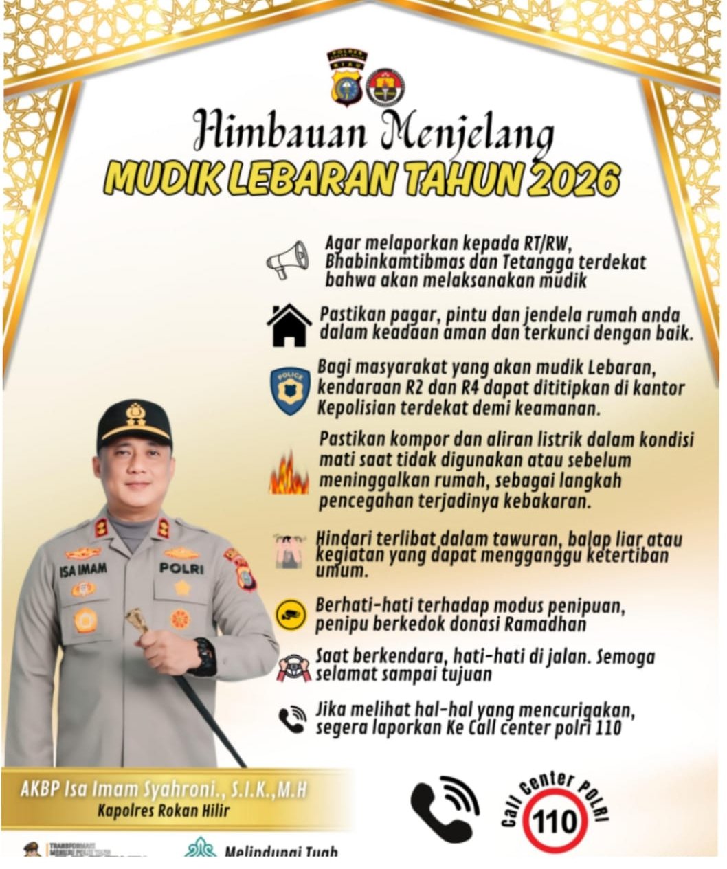 Rohil – Menghadapi mudik jelang perayaan Hari Raya Idul Fitri 1447 Hijriah tahun 2026, Kepala Kepolisian Resor (Kapolres) Rokan Hilir, AKBP Isa Imam Syahroni, S.I.K., M.H., mengeluarkan serangkaian imbauan dan fasilitas untuk memastikan masyarakat dapat menjalankan tradisi pulang kampung dengan aman dan tenang.