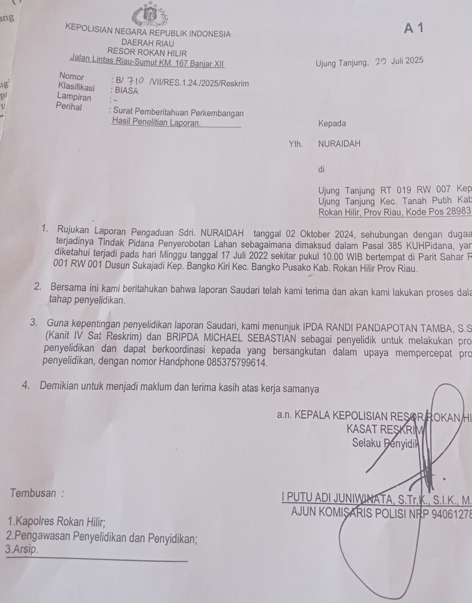 Hingga saat ini, korban menunggu keseriusan pihak kepolisian untuk menindaklanjuti laporan ini dan memulihkan haknya yang dirugikan, serta memproses hukum pihak yang terbukti melakukan perbuatan melawan hukum sesuai Pasal 385 KUHP tentang Penyerobotan.