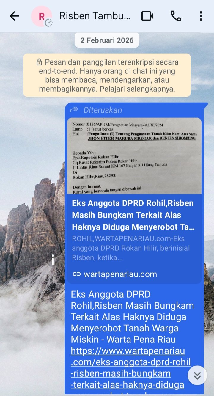 Rohil – Risben, mantan anggota DPRD Kabupaten Rokan Hilir sekaligus Sekretaris Partai Golkar Kabupaten Rokan Hilir, blokir nomor WhatsApp tim media setelah ditanya terkait laporan kepolisian mengenai dugaan penyerobotan lahan dan pengerusakan tanaman sawit milik keluarga Sitompul di Desa Bangko Sempurna, Kecamatan Rimba Melintang.