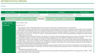 Dumai – Jaksa Penuntut Umum (JPU) Kejaksaan Negeri (Kejari) Dumai menuntut 10 tahun penjara serta denda Rp 300.000.000 kepada Alex Sander alias Alex Bin Sudirman dalam kasus peredaran narkotika jenis shabu (metamfetamina) golongan I dengan berat sekitar 1 kg. Tuntutan tersebut dibacakan di Pengadilan Negeri (PN) Dumai pada dsidang tuntutan, Senin, 30 Maret 2026.